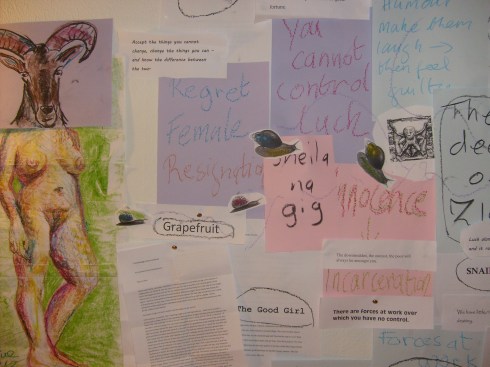 It’s hard to say what pulled me through that scary time. There were a few ‘angels’ around me , but certainly one of the triggers was putting together a ‘ Wonderwall’. My wonderwall is based on an exercise passed to me by a fellow artist who works in performance and uses the wall method to structure, hone and shape his thoughts when devising a new piece. The Wonderwall (my label, not his) is akin to a spidergram, but poster size, allowing you to lay out your thoughts visually, using text, images, colour, shape and form. The Wonderwall particularly appealed to me, coming as I do from an fine art background.
