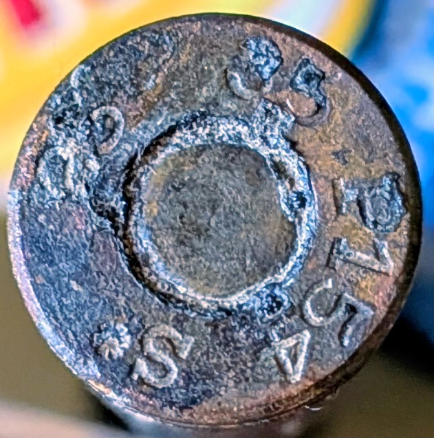 This is my haul. A WWII ammunition cartridge! It’s a German 1935 Mauser round, potentially live, as the bullet is not spent, but it’s so corroded it’s surely fine. Still, I’m a bit nervous to go at it too aggressively with the old Brasso, so have contacted the police offering to send them photos to ask for their advice. I have no idea why there’s German ammo at Hammersmith, but this is what the serial code says… (and this is where a story is suggested).